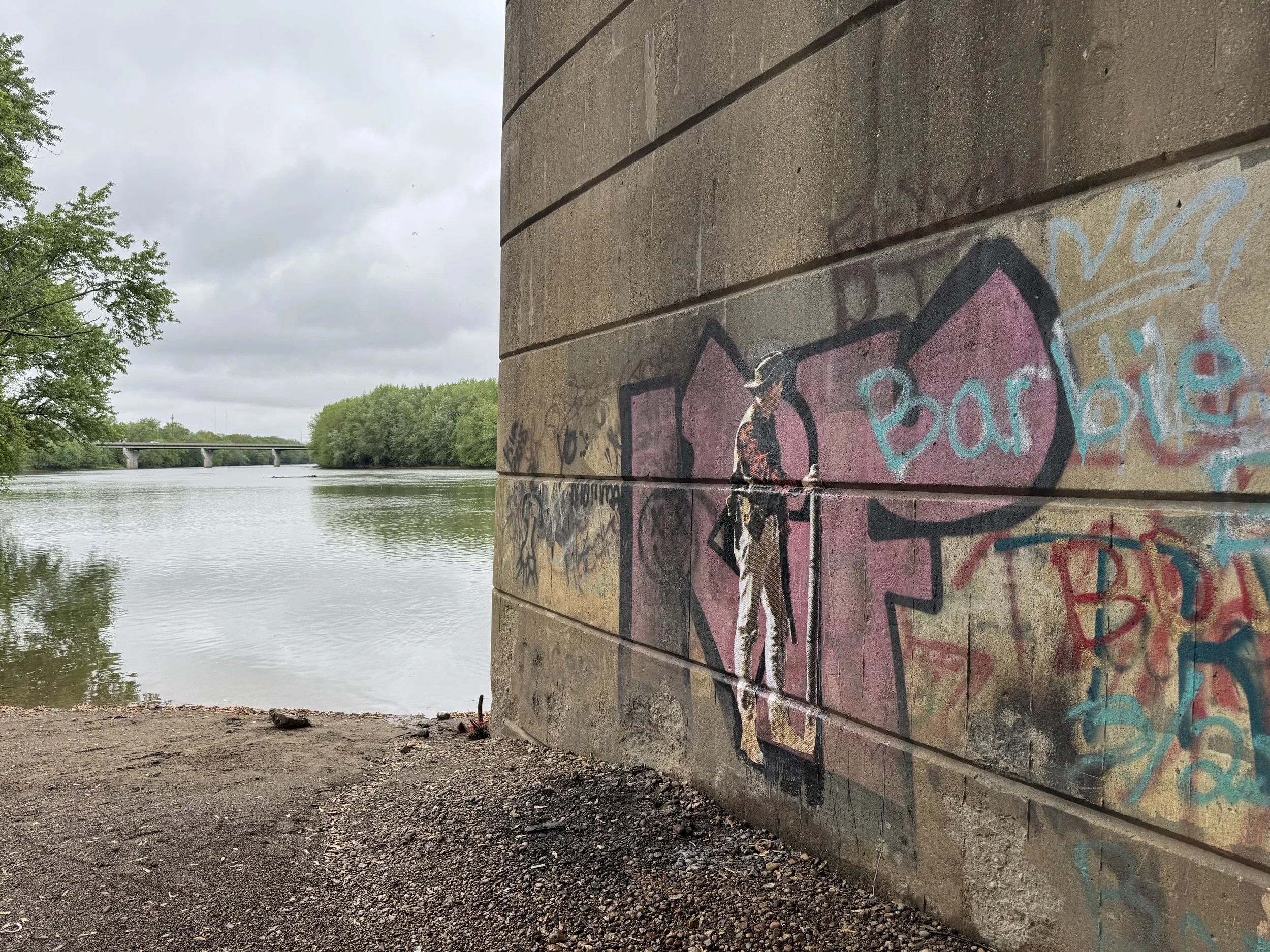 These pieces are blown up images from a men’s sporting book from the 60’s or 70’s. The dots of the halftone printing process are evident in the large scale, emphasizing the era from which they originated. They are vague and interpretable as they are clearly men with guns, but their motives aren’t obvious out of context. Are they hunters? Are they militia? Their poses obscure their faces so we are left with an unsettling feeling of wariness as we stumble on these giant figures along a path or under a bridge. They are clearly out of context due to their scale, but they also blend into the cityscape as graffiti and seem like they’ve been around a while due to their vintage quality. They represent something that is everpresent regardless of if it steps into the light. When it can’t be seen in the open it’s in the book in your basement. It’s an idea that could be threatening or could offer protection. And that lack of clarity between threat and protection may be the most important characteristic of that idea.