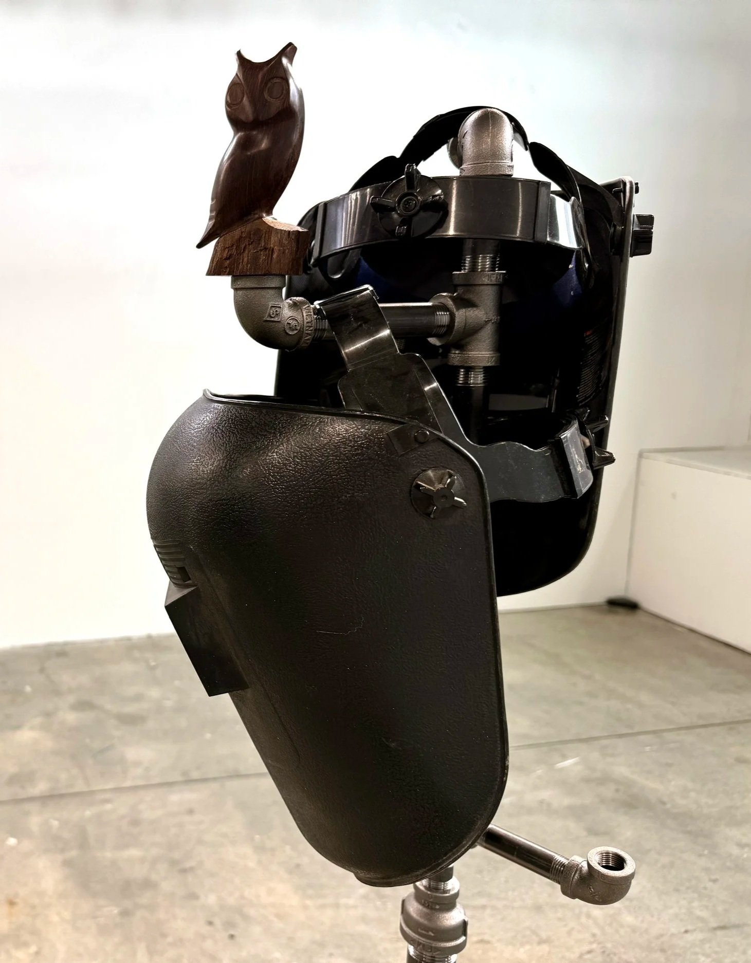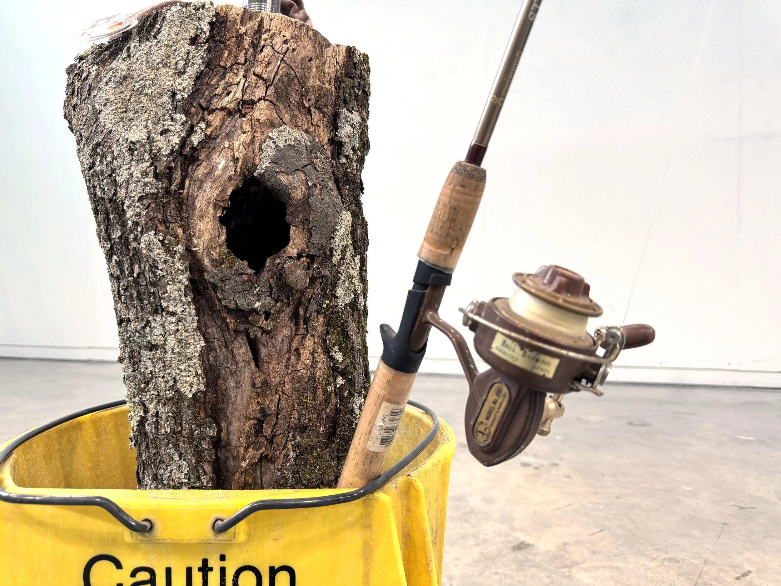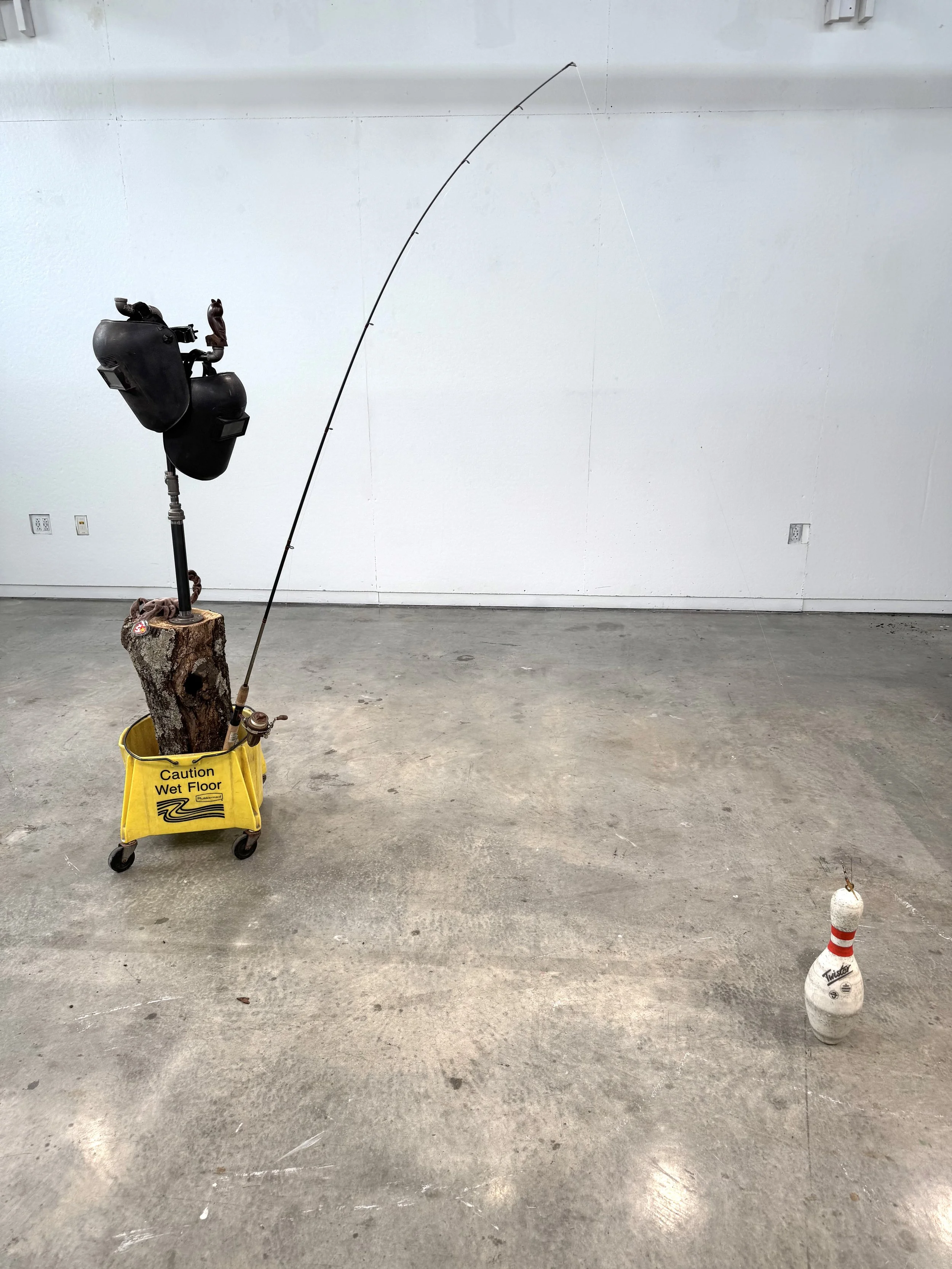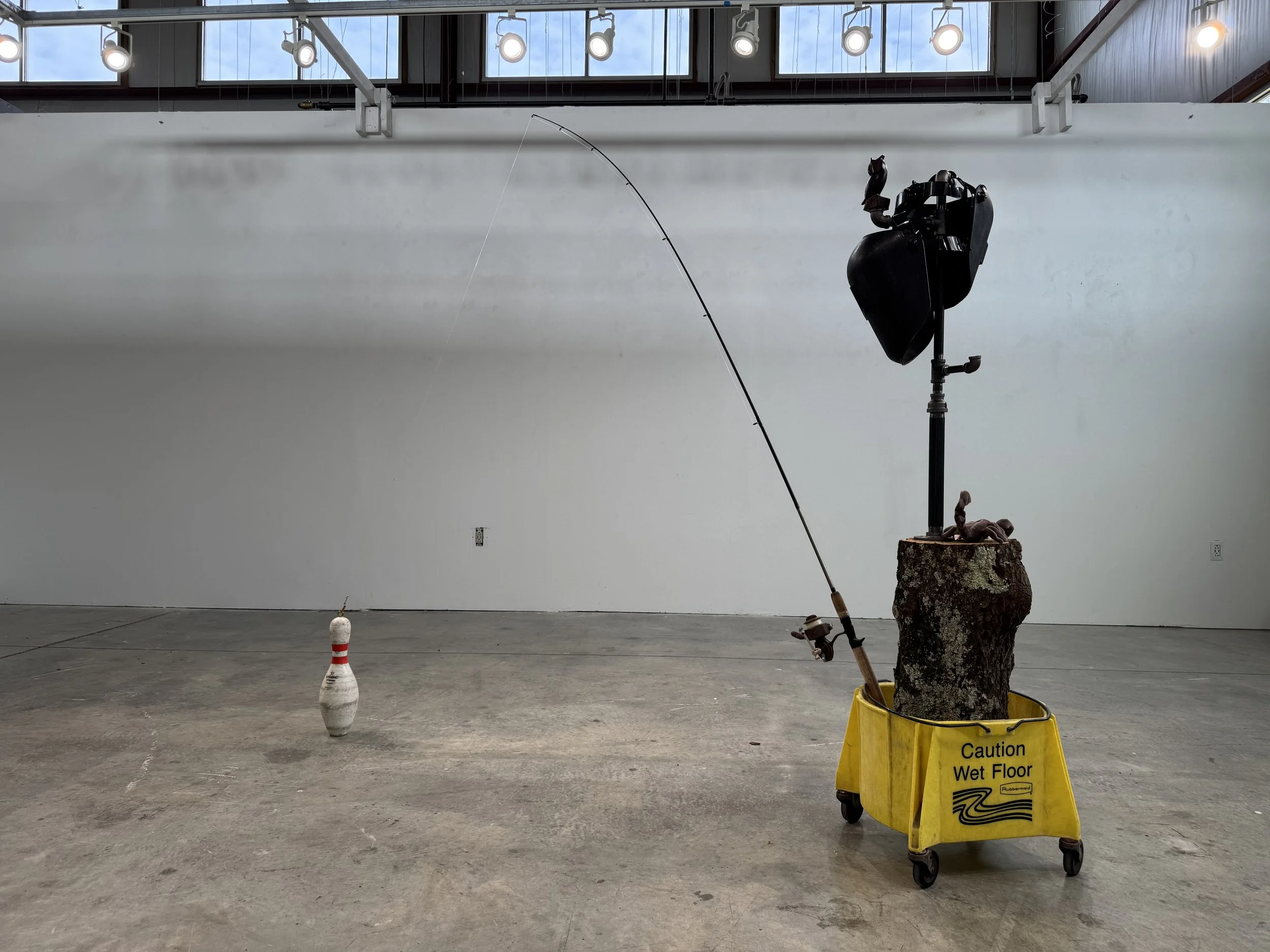 The materials are specific, but don’t require an interpretation by the viewer that is exactly in line with my own. The symbols bounce between universal, personal, and intuitive. The narrative described by the sculpture is about searching, surprise, and the absurd, but it is grounded in very real, recognizable objects and nods to an extremely earthly creation point with almost elemental materials like a tree trunk and metal pipes. It was formed out of a time that is not linear and operates with rules based both in reality and absurdity. It is in large part made up of visual references to the UFO phenomenon and reflects the hyper-object nature of that phenomenon with its inconsistencies that are strangely cohesive and it’s existence as both solidly real but also completely interpretable by the viewer.